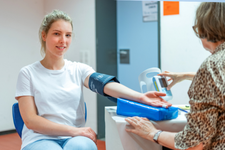 Ein Arzt oder eine Ärztin bespricht mit Ihnen den ausgefüllten Fragebogen, die erhobenen Gesundheitsdaten und entscheidet dann, ob Sie heute Blutspenden können. Ebenso wird der Blutdruck und der Puls vor jeder Blutspende geprüft.